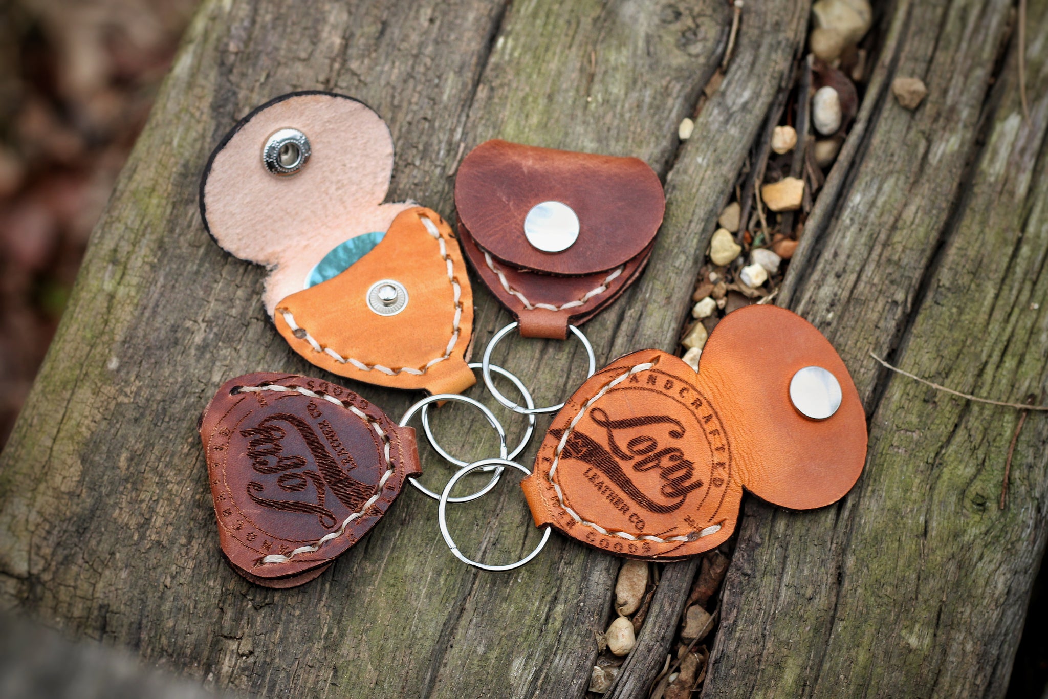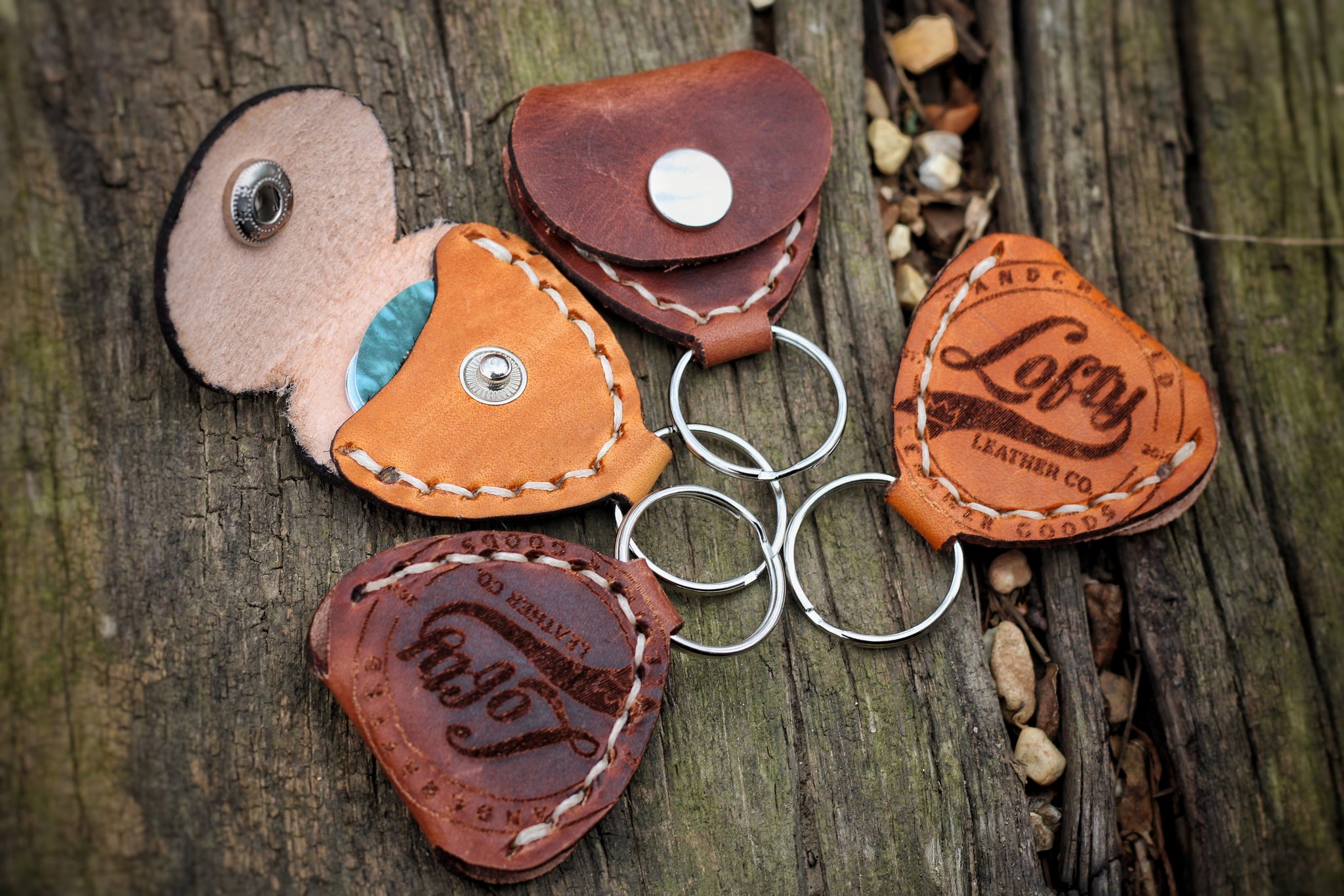 Hand-stitched with meticulous attention to detail, each key fob boasts durability and reliability, ensuring your guitar picks are always secure wherever your musical journey takes you. The natural grain and texture of the vegtan leather lend a timeless elegance to these key fobs, while also providing a soft and supple feel in your hand.